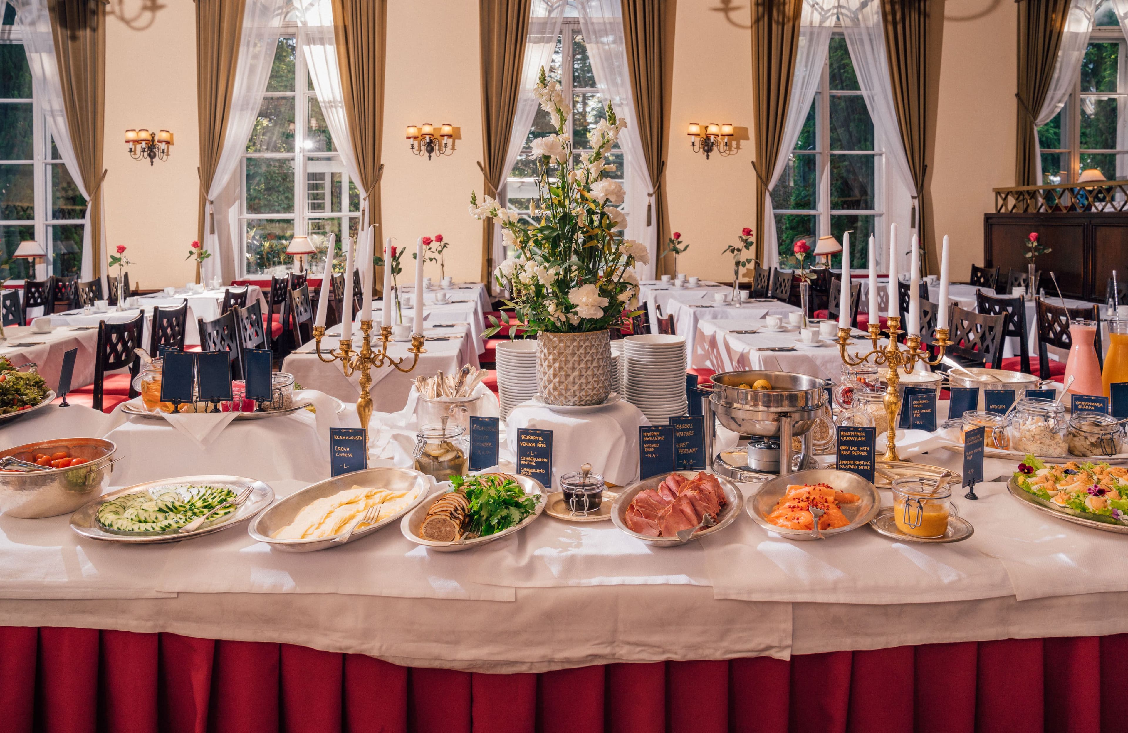 Pääruoan voit valita pöytään tarjoiltavista kala-, kasvis- ja lihavaihtoehdoista, koko seurueelle yksi yhtenäinen pääruoka. Huomioimme aina erityisruokavaliot saatuamme niistä lisätietoja ennakkoon. Aamiaisen yhteydessä tarjoiltavan pääruoan hinta on 17 €/ hlö.